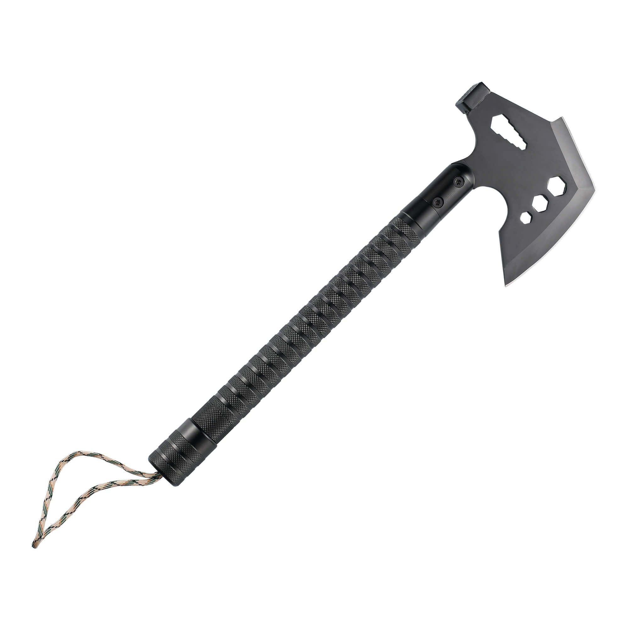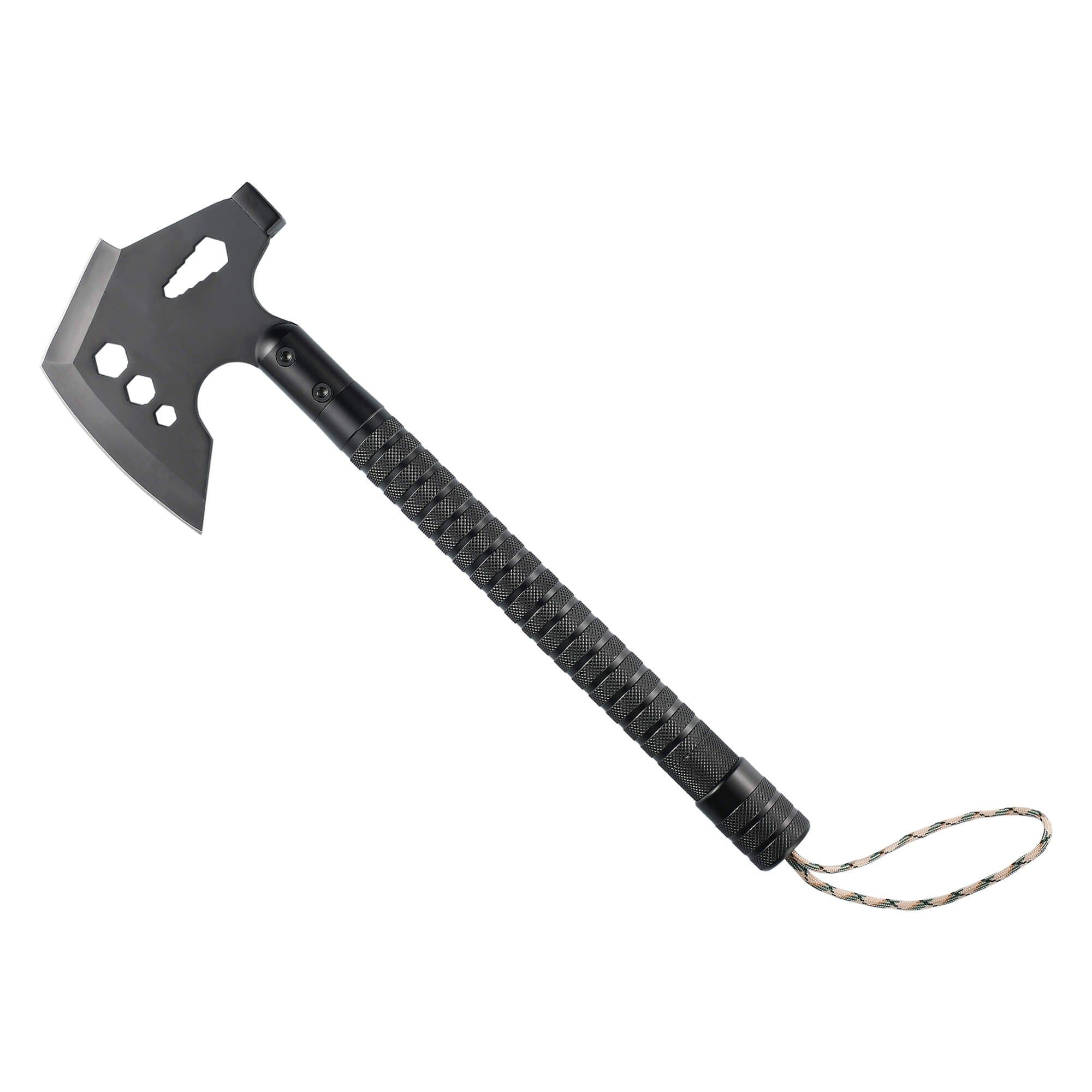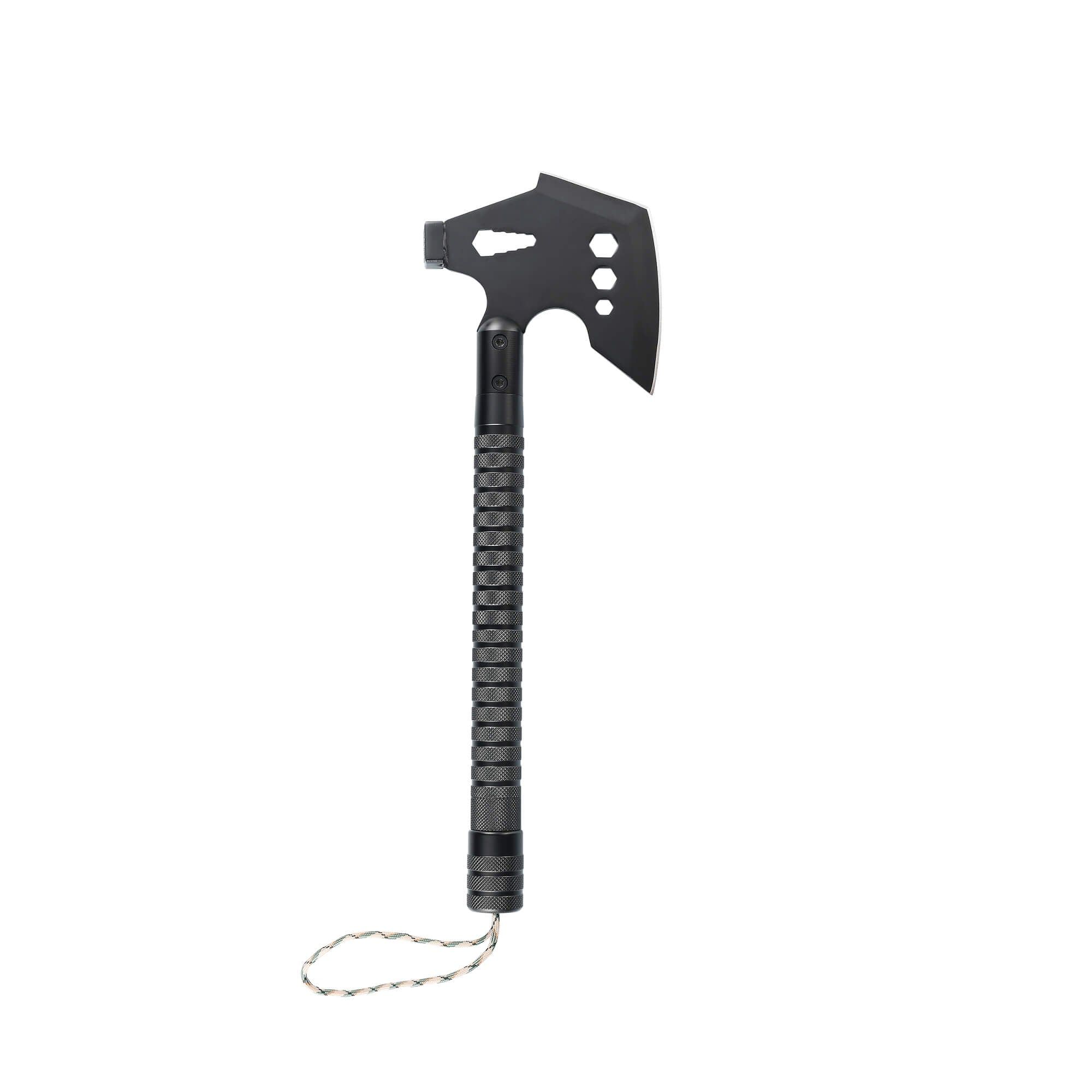The GRID-AX, a multi-feature, sturdy, camping tool. The anti-slip handle and the strong blade create a perfect balance between power and sustainability. It features an axe knife, wood saw, bottle opener , whistle, flint stone, glass breaker, compass, rope, and a hex wrench.
