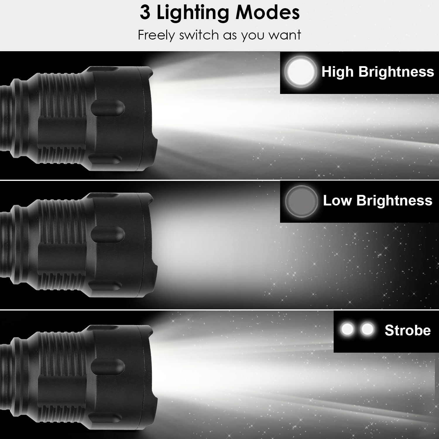 *Zoomable Flashlight*:Our premium LED is designed with adjustable focus. You can stretch the head to adjust its focus and get spot beam and flood beam as you want. You can easily light up an entire room or focus on distant objects.