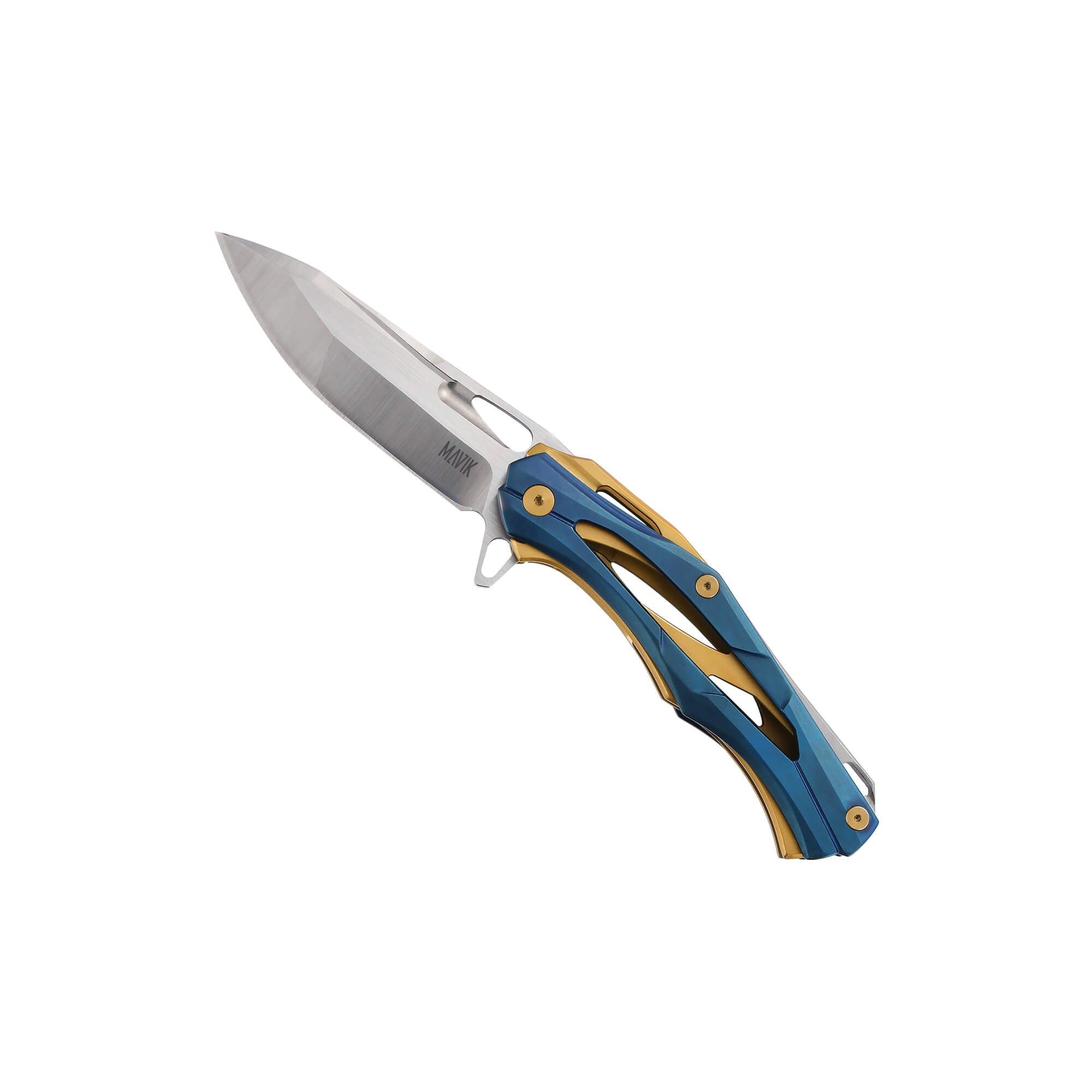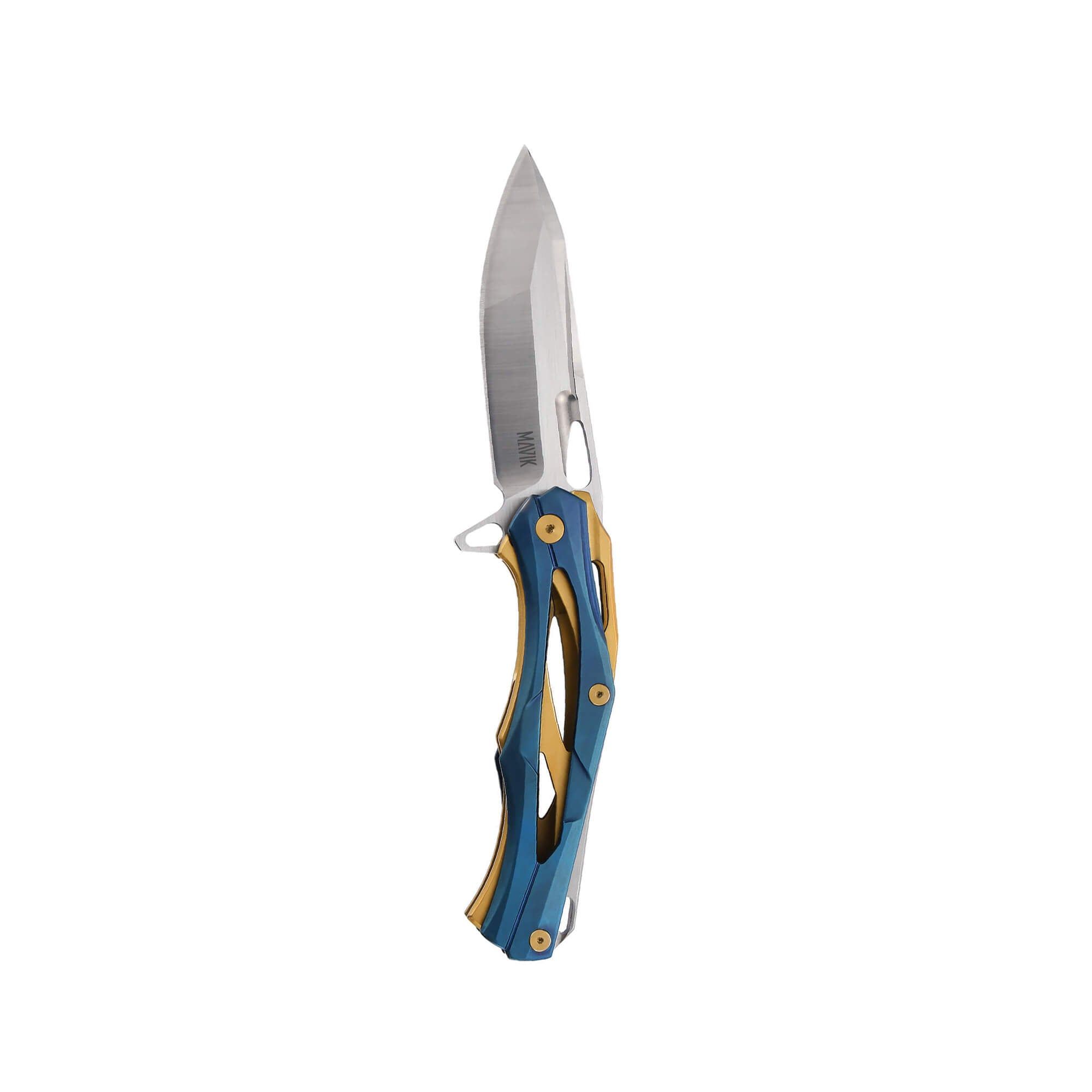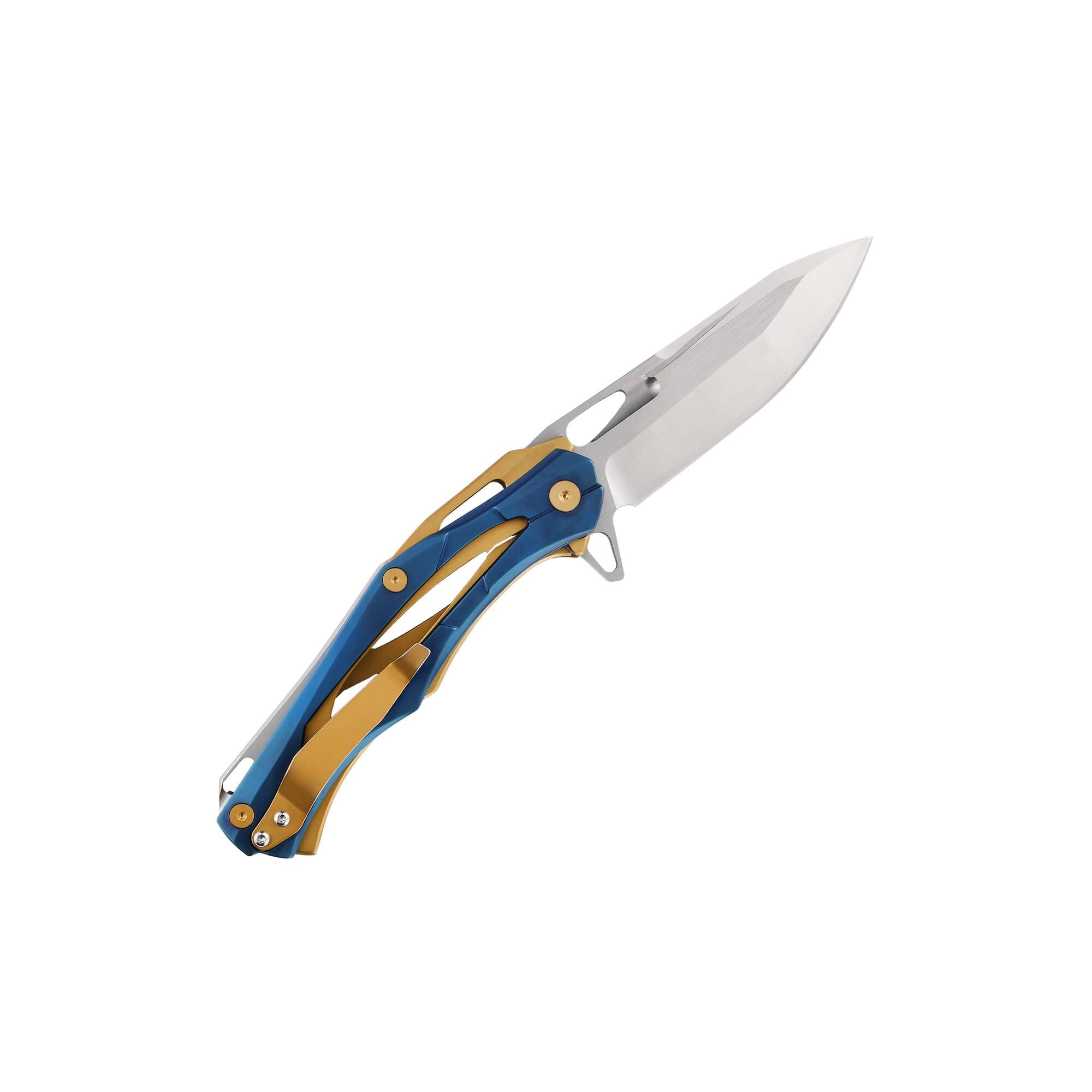 The Morpher is a remarkable folding knife with handle details in steel and blue titanium with tyrant gold. It secures with a liner lock and includes a pocket clip.