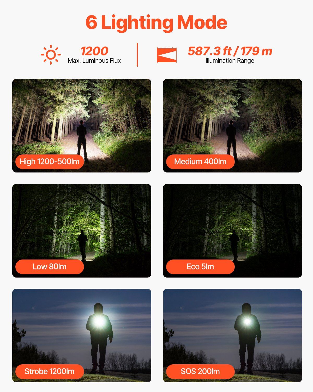 1.Super Bright with 6 Modes : With 6 lighting modes (High/Medium/Low/Eco/Strobe/ SOS), 1200 lm maximum luminous flux and 587.3 ft (179 m) illumination range, this high lumens flashlight ensures powerful, reliable lighting, perfect for hiking, camping, and emergency situations.